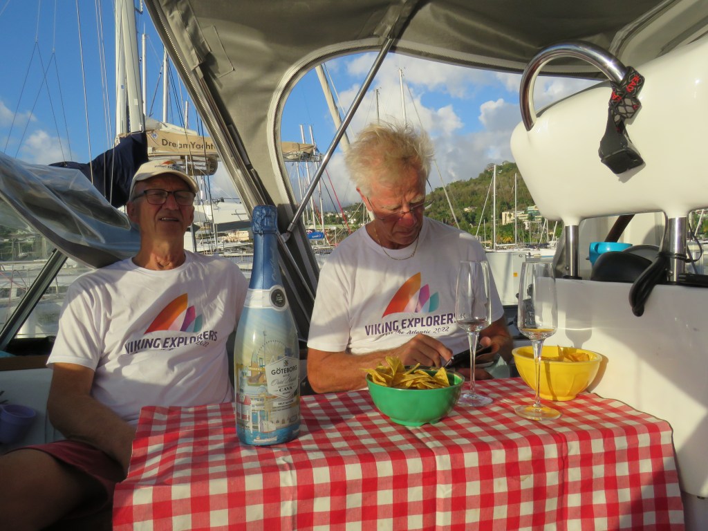 TIPS!!! trycker ni på bilderna nedan så får ni större format. Fortsättning, när vi hade kommit till Grenada, ST George. Gänget som var kvar i hamnen Port Louise hade bokat restaurang och vi var inte svår övertalande, vi följde gärna med. Det var också alla hjärtans dag. Fast vi kom 10 dagar senare så hjälpte Viking Explorers, Carlotta att klarera in oss i dessa covid tider. Efter feber tagning, visning av covid pass, Tindras papper och våra pass var vi officiellt inne i Grenada och vi kunde flytta från karantän bryggan till hamnplatsen. Vi hade sparat champagne som vi hade fått på våran avseglings dag och skålade för lyckad överfart inga större skador på oss eller på Tindra. Därefter plockade vi ordning lite grann och tog oss en ljuvlig dusch. Det var lite si så med balansen allting gungade. Det var jätte roligt att träffa de andra, maten var jätte god. Tyvärr hade vi fått ett bord bredvid ett par som underhöll gästerna med sång och spel. Det blev att vi inte kunde höra varandra, sångerskan var jätte duktig och hade fin röst men det kunde vi ha sluppit första kvällen. Vi ville höra hur de andra hade haft sin överfart. Sitta och äta vid ett bord som stod stilla och använda kniv och gaffel, porslin och glas det kändes lyxigt. Vi fick här också ett mycket fint välkomst paket från Viking Explorer och hamnen Port Louis.