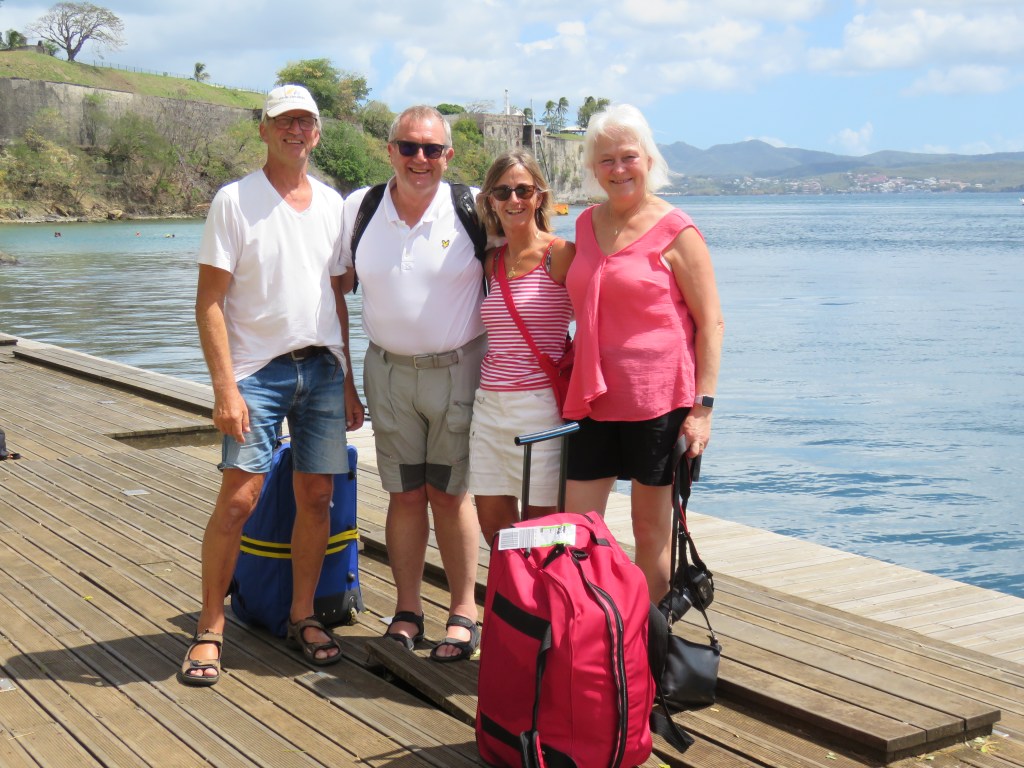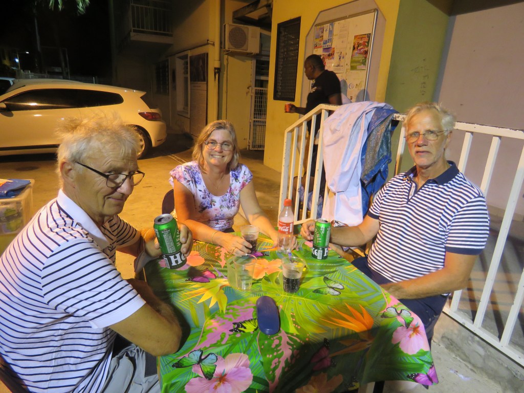 På söndag eftermiddag gick vi till ST Anne och förbi klippan Diamant. På kvällen gick vi ut och åt. De få restauranger som finns var bokade för de var karneval Mardi Gras. Vi gick till en annan restaurang vid busshållplatsen där var också fullt men då tog ägaren fram bord och 4 stolar och satte oss på busshållplatsen. Vi blev firad i förskott. Vilka mysiga vänner. Måndag kunde vi klarera in och oron släppte, vi blev så besvikna vi behövde inte visa upp PCR testet som vi har haft sådana besvär med och det kostade dessutom 1200 kronor/person. Vi gick runt och strosade, handlade lite grann sedan åkte vi i väg för att snorkla och bada, vi hittade inte någon bra plats att förtöja dingen så det blev i stället bad för oss alla tre, Lars vaktade Inger, dingen vid stranden sedan var det packning för Carina och Peter. Vi åkte in tidigt för Peter och Carina hade pratat med turist byrån hur dom skulle få tag i taxi till flygplatsen och fick några telefon nummer som dom skulle ringa. Peter försökte ringa men fick inte tag i någon taxi det blev lite panik tillslut fick vi tag en taxi som kom körande, taxiföraren var upptagen men skulle komma tillbaka, han kom tillbaka efter en stund och plockade upp Carina och Peter. PUH!!! Det kändes jätte tråkigt att säga hejdå efter 8 veckor som vi hade varit tillsammans. Vi har haft så roligt och det blev bra på alla sätt och vis fast med covid och alla tester och grus i planeringen. Det kändes jätte tooooomt när vi kom tillbaka till Tindra.