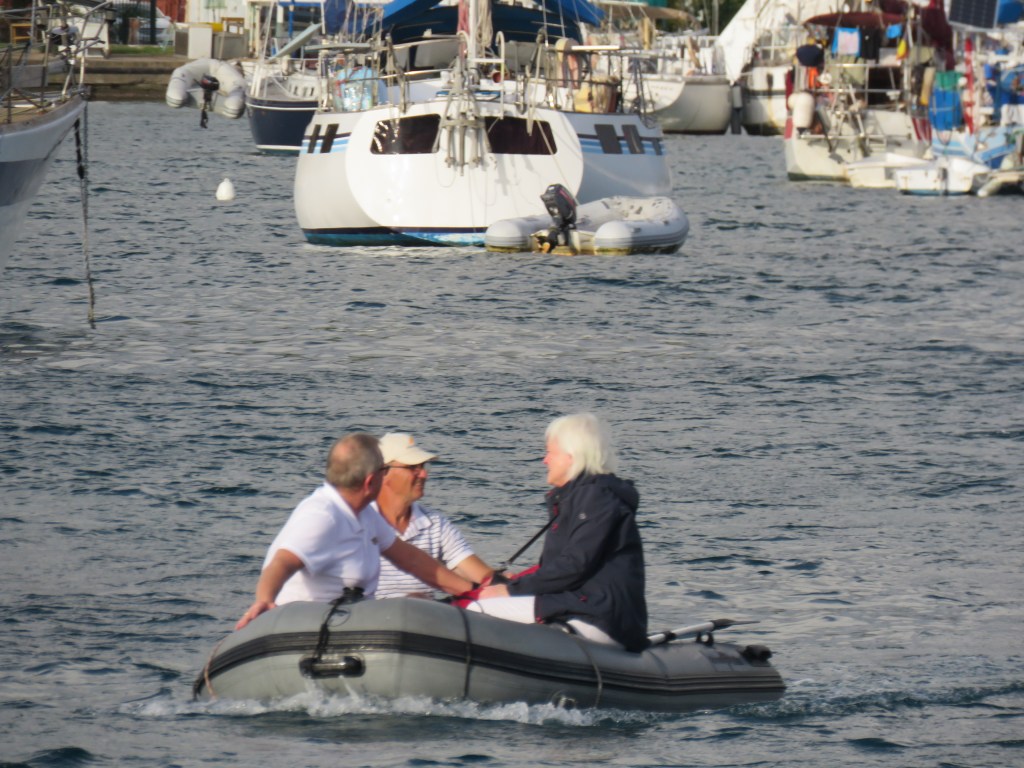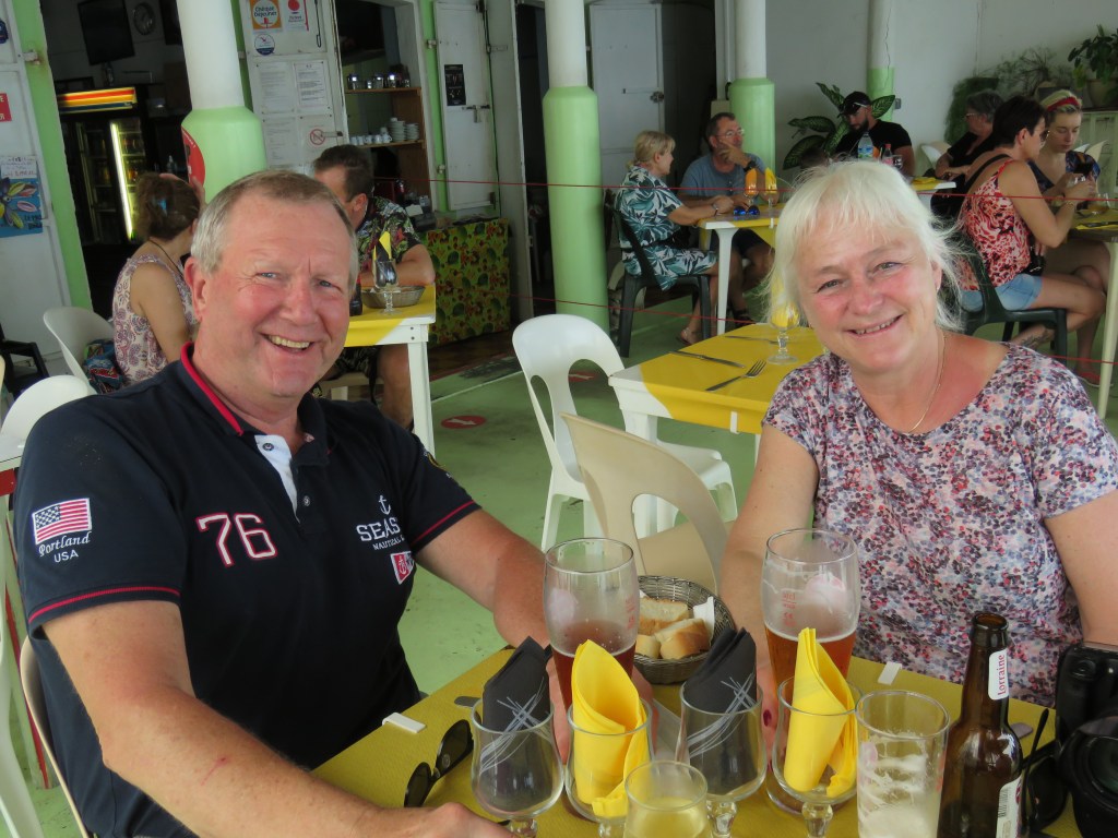 Tisdag den 8:e mars, senare eftermiddag kom äntligen våra kära vänner och skulle stanna i 14 dagar. Första kvällen kvällen njöt vi bara vara tillsammans. ABB installerade sig och packade upp. Dom hade också massa saker med sig till oss som vi hade skickat på lista. Alltså man har så fina vänner, Peter och Carina hade en röd och svart plast mugg hemma som dom gav oss för våra muggar i samma färger hade gått sönder, dessa skickade dom med ABB, vilka sötnosar och (klädnypan som satt fast på Peter tröja). Vad kul!! Dagen efter gick vi tillbaka till ST Anne för att ABB skulle kunna ta första doppet och sedan visade vi ST Anne och åt lunch, handlade vad vi hade missat. Vi gick till tomat gubben han var en rar äldre krokig och böjd man som sålde lite grönsaker förstod ingen engelska men hela kroppsspråket var så vänligt och han log visade på mini räknare hur mycket det kostade.