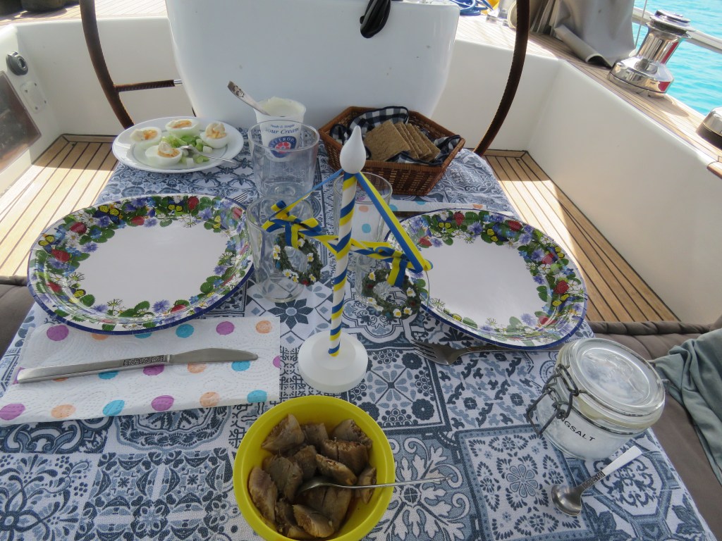 Midsommar kom och vi fick tag i holländsk matjessill som smakade bedrövligt det fick gå till fiskarna. Vi gjorde några lyckliga. Det var också dyrt. Det var en chansning!! Vi fick även tag i gräddfil, lök, norsk knäckebröd och jordgubbar det var i alla fall gott och annat smått och gott. Det blev en liten nubbe till som vi hade fått i ett paket med små flaskor med olika sorter i avseglingspresent.