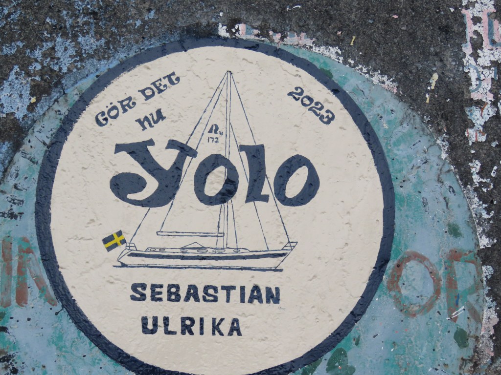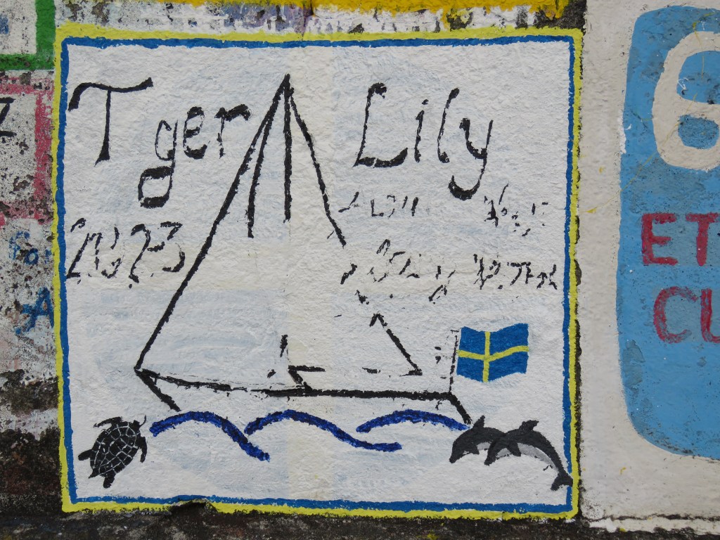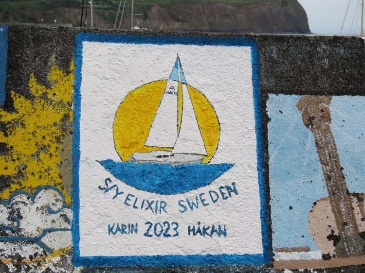 Vi seglade vidare till Velas på ön Sao Jorge 17 juni. Nu hade vi sagt hejdå till alla vännerna och vi har alla olika planer. Förhoppningsvis kommer vi ses någonstans. På Horta är det tradition att måla båtens märke på piren. Vi är med på ett hörn.