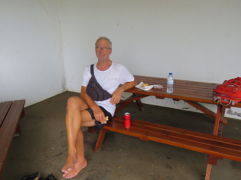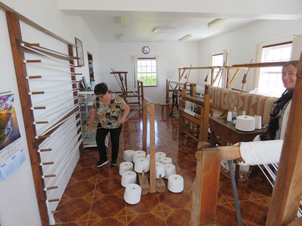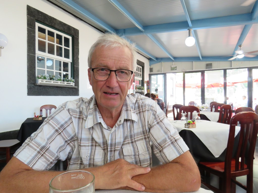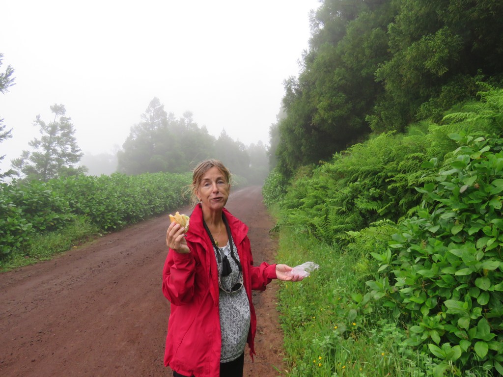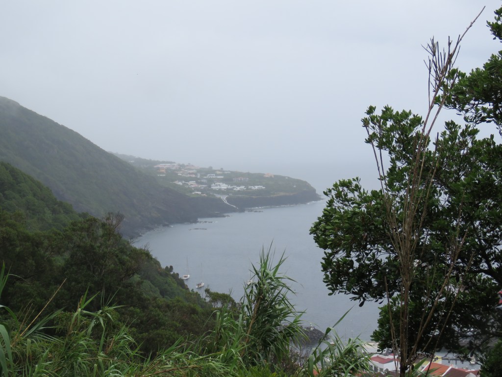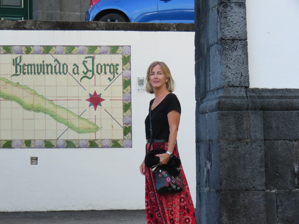 Vi fortsatte att ö luffa, våran nästa ö som vi seglade till var ön Sao Jorge som är en av hörnen så kallade triangelöarna tillsammans med öarna Pico och Faial. Vi seglade från Faial/Horta till Sao Jorge/Velas, 23 nm det tog ca 4,5 timmar. Vinden var i fel riktning för att kunna ligga på ankare och vi bestämde att vi försöker få en hamnplats, hamnen är inte stor. När vi var i hamnbassängen så ropade vi upp hamnkapten och det tog inte många minuter förrän en mycket glad hamnkapten som informerade att hamnen är full men han kunde ordna en plats om vi kunde tänkas oss att lägga oss utan på en annan båt vid kajen. Vi tackade och åkte in och förtöjde. Det var den trevligaste hamnkapten som vi hade träffat så tillmötesgående, glad och han berättade hur det är att bo på en mindre ö. Sao Jorge är en långsmal ö, 56 km lång och 8 km bred och är känd för sin smakrika ost. Vi strosade runt i den lilla pittoreska, charmiga staden. Vi trotsade regnet en dag och tyckte att nu är det säkerligen uppehåll så vi köpte med oss matsäck och skulle gå upp på höjden för det skulle vara en fin vy över staden. När vi kom halvvägs så började det regna igen tur att vi hade regnjackorna med oss. Det blev lunch i en litet skjul med tak.