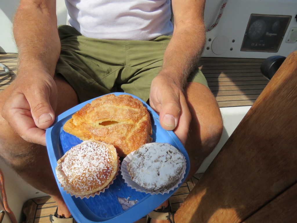 Vi kastade loss från Angra do Heroismo, ön Terceira, kl. 10:30 den 2 juli. Medan Lars fixade de sista på däck sprang jag upp till konditoriet. På Azorerna finns många goda bakverk och det måste vi ha på seglatsen.