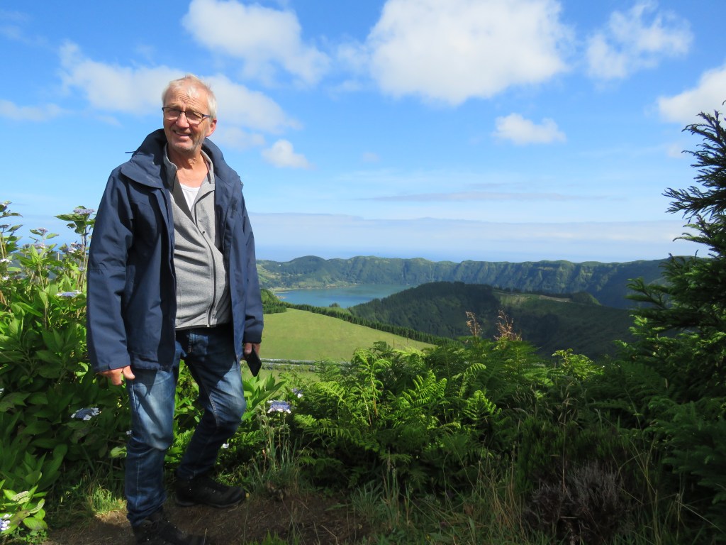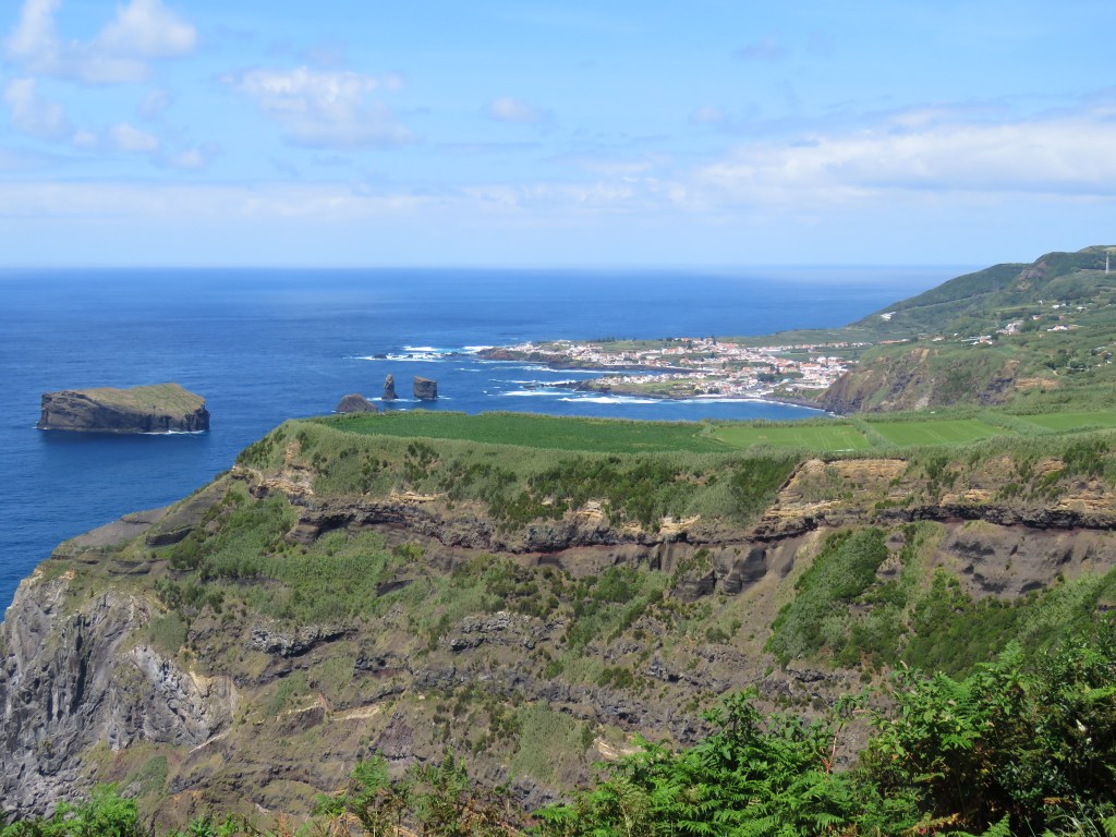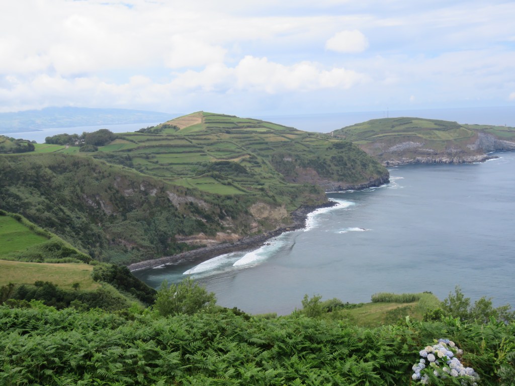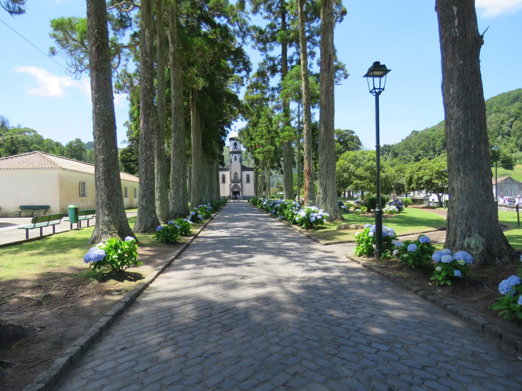 Vi fortsatte att upptäcka ön med att hyra scooter i tre dagar. Vi fick en helt ny och jag fick välja färg såklart blev det röd. Dag 1 tog vi oss västerut till sjön Azul (blå) och Verde (grön). Det är två vulkankratrar som har blivit sjöar. Färgerna beror på djupet av sjöarna. Det förbinds med en bro i mitten av ett smalt sund. Det sägs att det finns en kärlekshistoria bakom de tvåfärgade sjöarna om en omöjlig kärlek vid första ögonkastet mellan en herde och en prinsessan som slutade med att prinsessan blev bort förlovad med en prins i ett annat rike. Deras tårar bildades dessa två vackra sjöar, en grön för prinsessans ögon och den andra blå, för herdens ögon var likaså färgade. Vad man än tittade så var det otroligt vackert. Vi tog oss ner för den slingrade vägen och stannade för en promenad längs sjön Verde efter ett tag satte vi oss och åt våran medtagna lunch. Därefter åkte vi till den andra sjön och gick längs sjön Azur här finns det en tunnel som man kan gå igenom för att komma ut till en sjö. Vi började att gå men det var så geggigt så vi vände tillbaka. I byn Sete Cidades besökte vi den fina, lilla kyrkan Igreja de São Nicolau och avslutade med en fika. Vi avslutade dagens tur med att besöka fyren Ferraria. När vi kom tillbaka till Ponta Delgada så var hela inner stan avstängd och poliser överallt. Det var en procession med oxar, kor, vagnar med olika mat och dryck mm. Dom firade den heliga anden. På kvällarna var det olika konserter i kyrkorna och torget. Vi fann tillslut en väg som vi kunde köra och hittade en parkering.