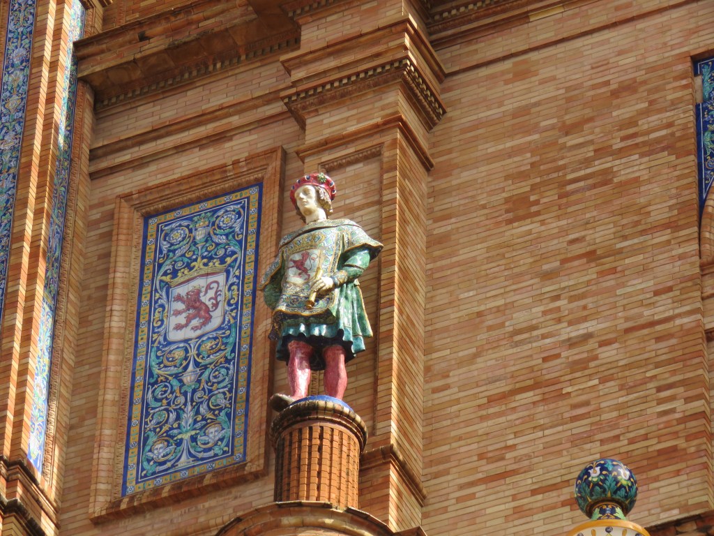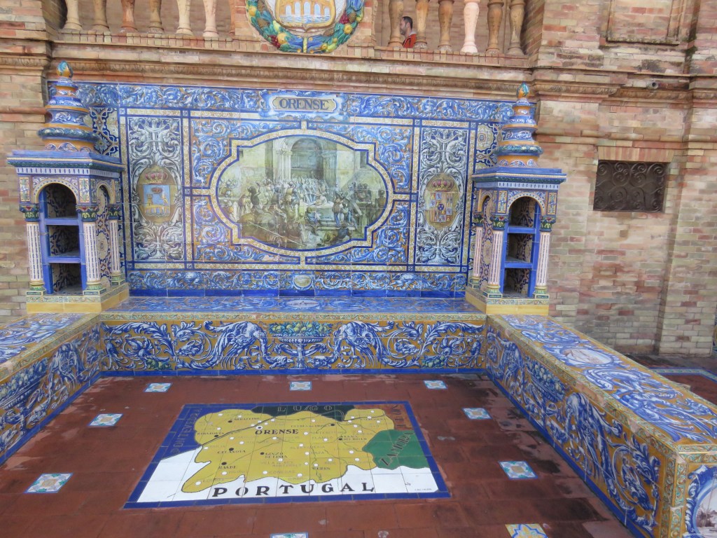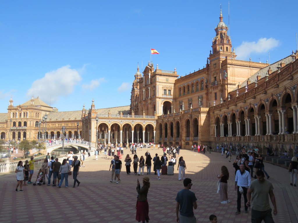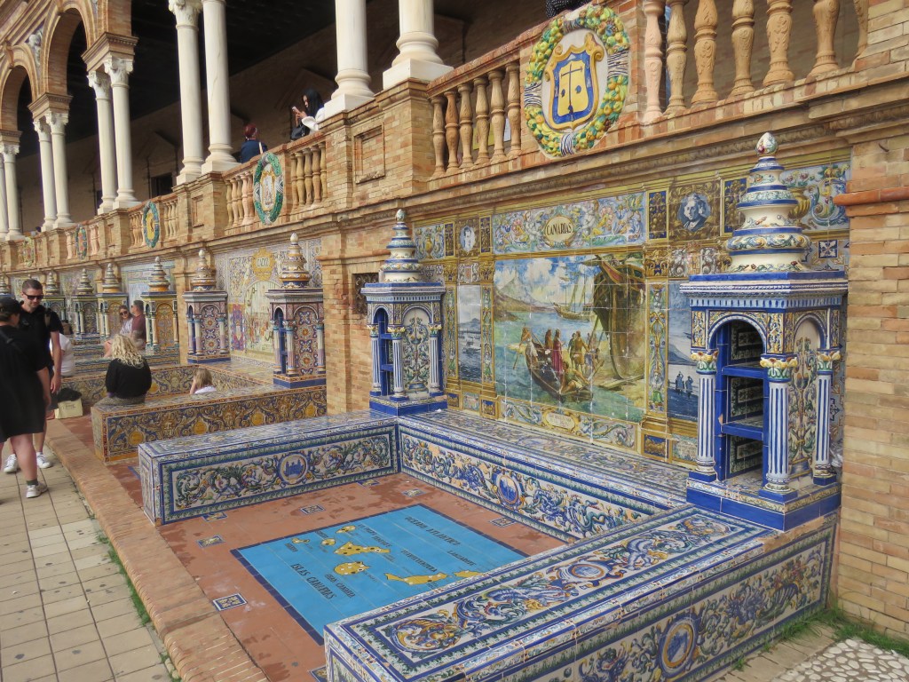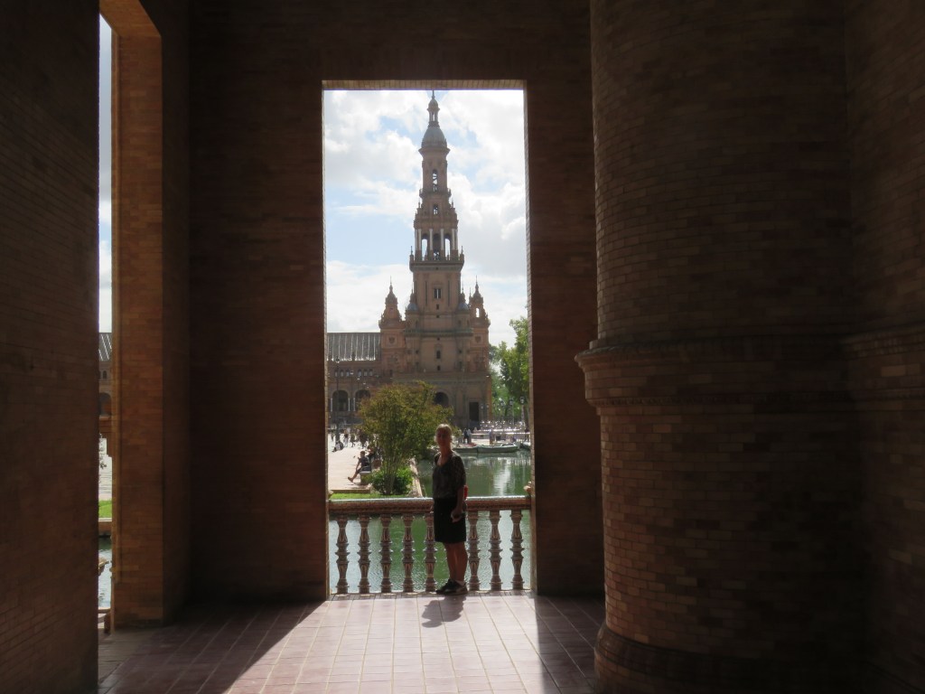 Det är hur mycket som helst att titta, besöka här i Sevilla och historia går långt tillbaka. De sevärdheter som finns är ex. Katedralen, Alcàcar, bron Triana, Tornet del Oro, Plaza de Espana, parker, alla fina hus med olika arkitekturer och mycket mer. Vi har sett Plaza de Espana som är arkitektonisk som ligger i parken Maria Luisa. Den byggdes mellan 1914 och 1929. Det är en otrolig vacker byggnad som innehåller bl.a. 48 bänkar som representerar i alfabetisk ordning 46 halvöar spanska provinser och de 2 ögrupper kanarieöarna och Balearerna, 4 broar som korsar över kanalen mm. Här uppträder de flamenco och spelas. Vi gick runt i många timmar. Sevärdheterna ligger cirka 15-20 minuter gångväg i från hamnen.