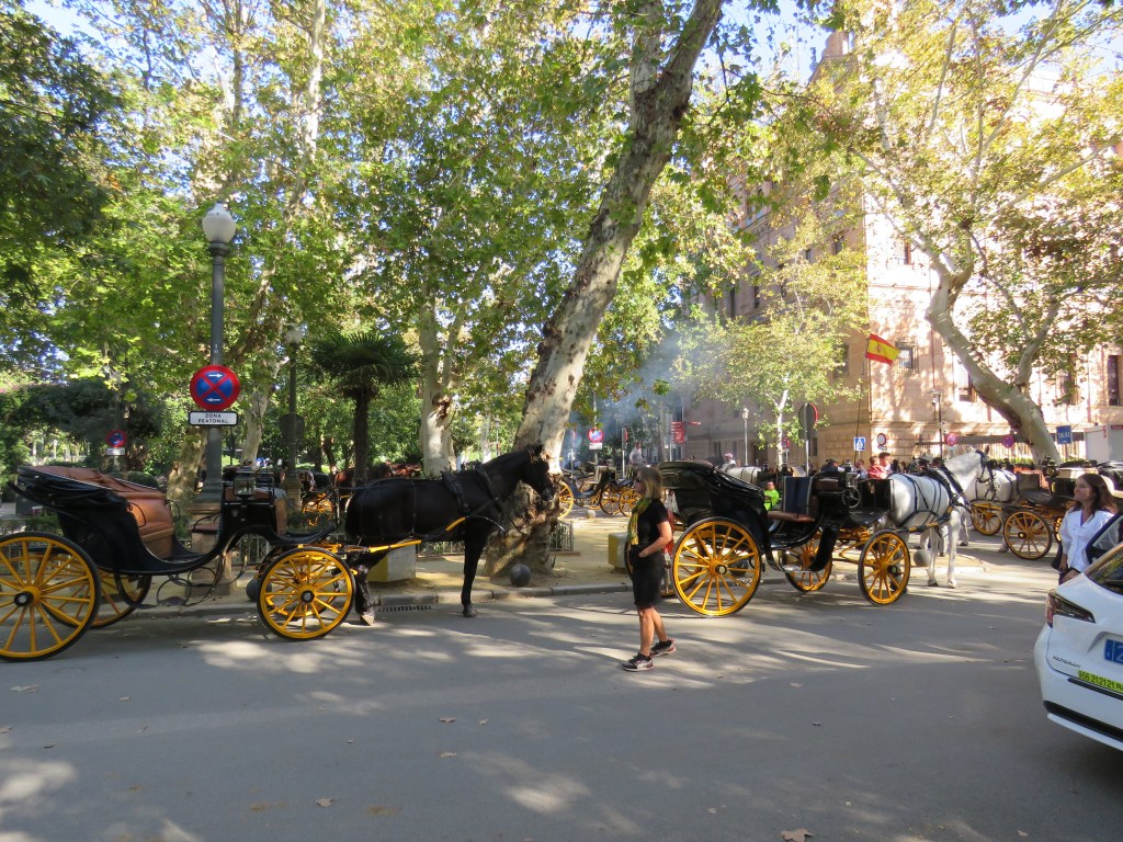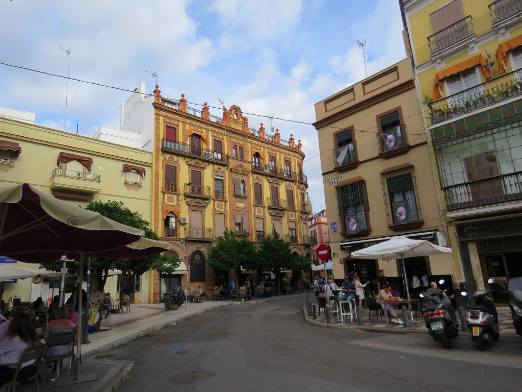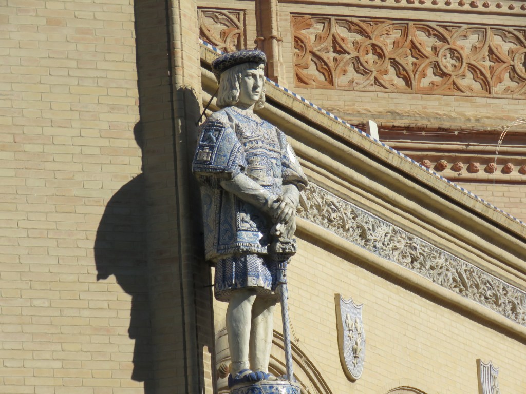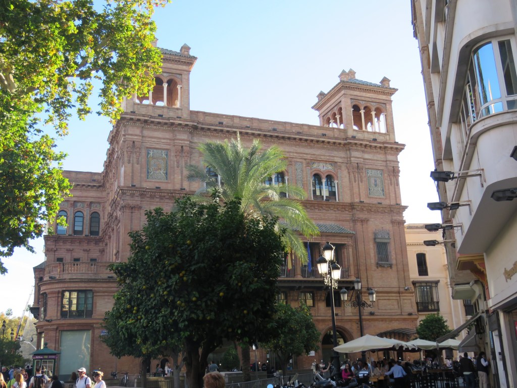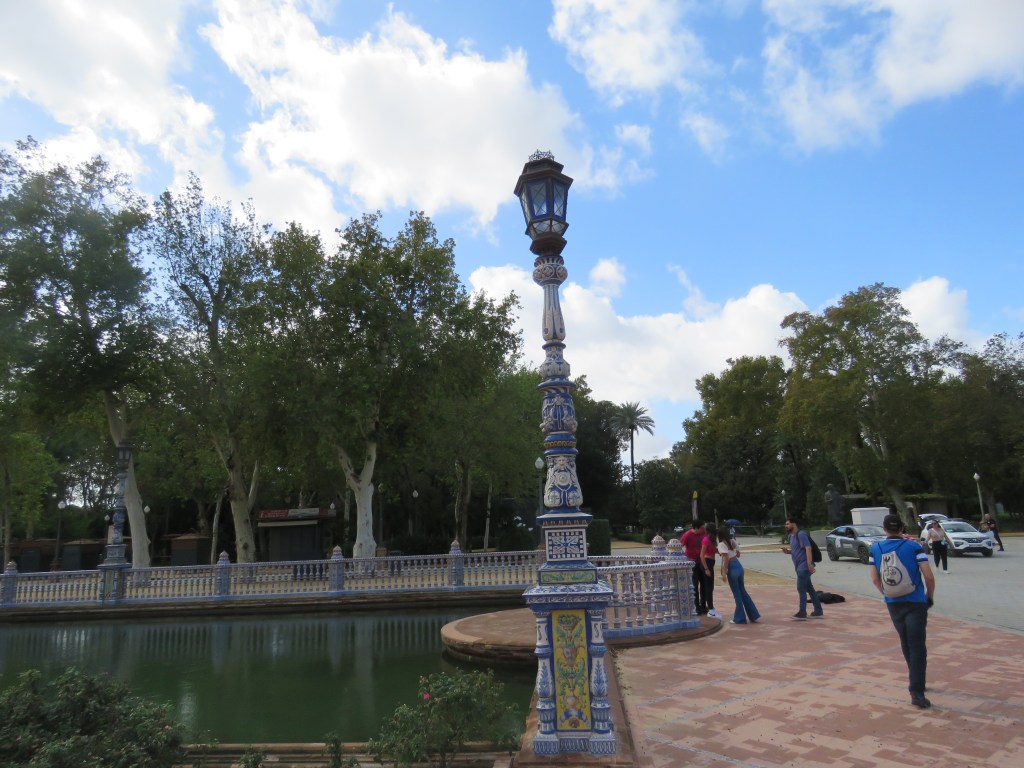 Det är hur mycket som helst att titta, besöka här i Sevilla och historia går långt tillbaka. De sevärdheter som finns är ex. Katedralen, Alcàcar, bron Triana, Tornet del Oro, Plaza de Espana, parker, alla fina hus med olika arkitekturer och mycket mer. Vi har sett Plaza de Espana som är arkitektonisk som ligger i parken Maria Luisa. Den byggdes mellan 1914 och 1929. Det är en otrolig vacker byggnad som innehåller bl.a. 48 bänkar som representerar i alfabetisk ordning 46 halvöar spanska provinser och de 2 ögrupper kanarieöarna och Balearerna, 4 broar som korsar över kanalen mm. Här uppträder de flamenco och spelas. Vi gick runt i många timmar. Sevärdheterna ligger cirka 15-20 minuter gångväg i från hamnen.