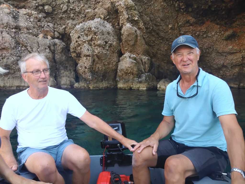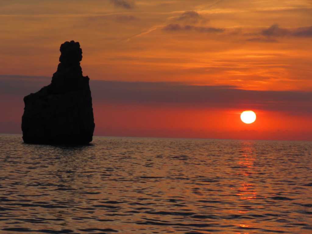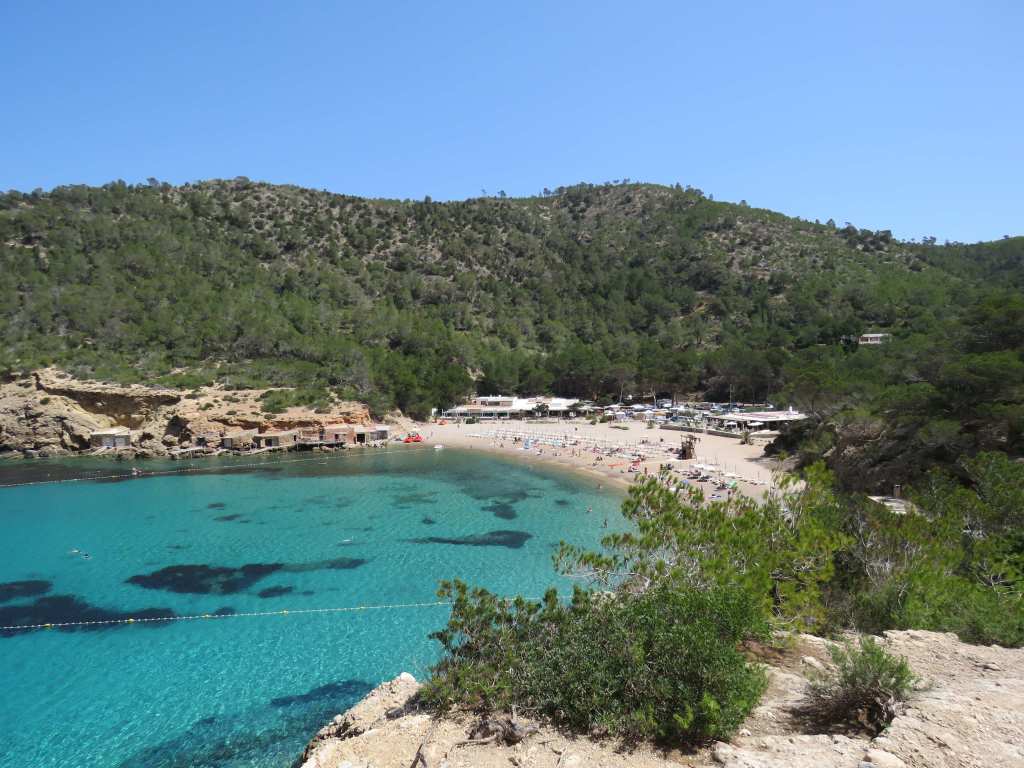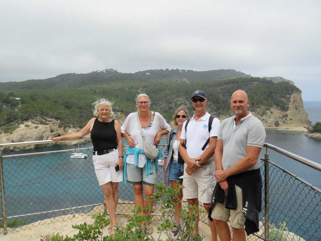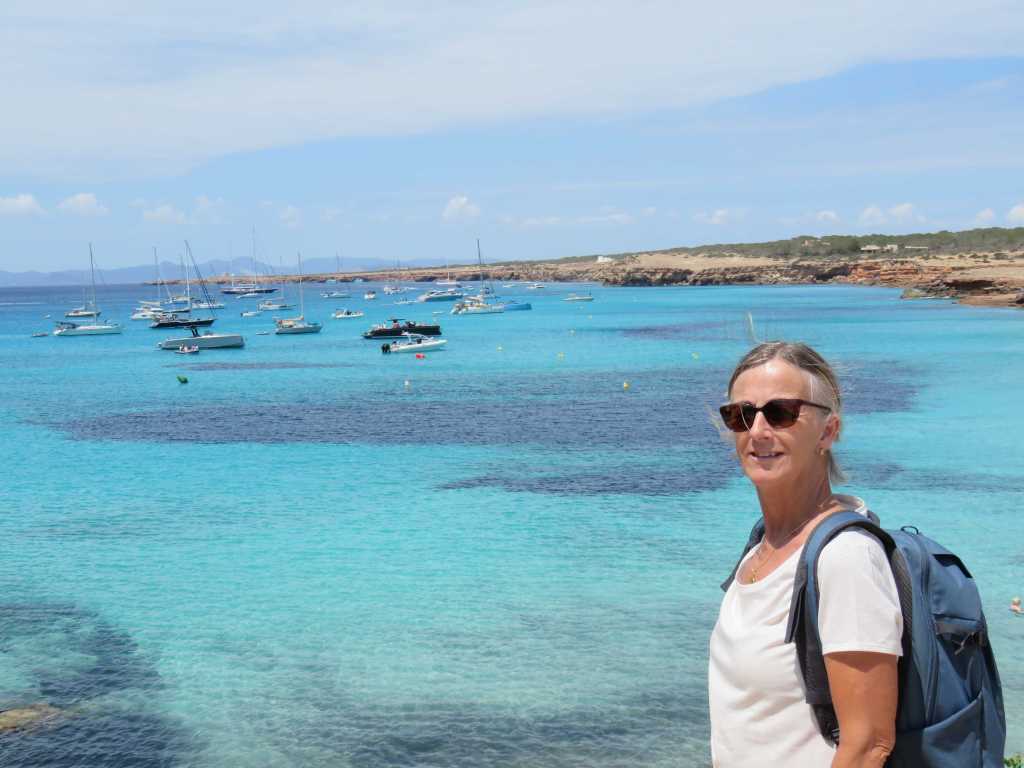 Nu ska vi upptäcka Balearerna. Det är samlings namn på öarna öster om Spanien. Det är 4 öar, Mallorca, Menorca, Ibiza och Formentera. Mallorca är störst. Vi startade att upptäcka Ibiza och Formentera. Vi fick en härlig segling ungefär halva sträckan till Ibiza. Jippi! vi kunde segla lite grann. Vi sladdade in i viken, Benirrás, 25 maj, kl. 13:15. Det blev 24 timmar och 133 Nm. När vi kom fram tyckte vi att vi kände igen en båt. När vi kom närmare såg vi att det var Andante. Jätte kul!! Nu har vi kommit in i posidonia världen. Det är sjögräs som ska skyddas från ankare och kättingen. Vi hade laddat ner appen, donia, här kan man se områden med sand och sjögräset. Appen får våran position och vi ser om det är bra att ankra, även när vinden vänder så att ankaret och kättingen ligger i sanden. Det är inte nog med det, när man ankrar ska man också ta hänsyn till grannbåtarna så att man inte krockar med varandra och att man har tillräckligt avstånd om vinden vänder. Man ska ha ankarkätting minst 3 gånger djupet helst 5 gånger. Vi försökte 3-4 gånger innan kapten var nöjd. Vi såg att Anna och Claes kom med dingen från land, dom önskade oss välkomna. När vi var klara åkte vi över till Andante och fick en landare. Det var jätte roligt att träffas igen. Det kändes att vi hade varit i gång ett dygn man hinner inte komma in i rutinerna med sömnen och maten. Vi tog det lugnt senare eftermiddag och kväll. Det blev äntligen bad i det ljuvliga vattnet det var så skönt. Vad jag hade längtat efter att kunna bada. Vi tog också en liten tur med dingen med Anna och Claes till en grotta. Den var så liten och låg. Vi kunde inte åka in i grottan. Kvällen kom och vi fick en fantastisk solnedgång. Man tröttar aldrig på soluppgångar eller solnedgångar. På kvällen lyssnade vi på trummorna från land, sandstranden och såg folk dansade, hoppade och tjoade under tiden solen gick ner. Den här stranden kallas också hippiestranden. Viken var underbar med den här speciella blåa vattnet.