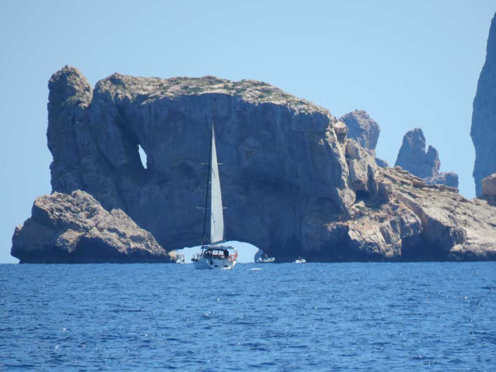 Nu började det närma sig att segla till Mallorca, Palma, där vi hade bokat hamn, 5 juni för våra godingar, Fredrik och Jossan som kom till oss den 7 juni. Vi seglade måndag den 3 juni, västra sidan på Ibiza till Portinatx. Västra sidan var dramatisk med dessa höga berg och spännande klippformationer. Vi passerade ett liten smal farled som man fick köra i mitten där det var djupast 3 meter. Portinatx var en typisk turistort. Kvällen tog vi den sista omgången sequence för den här gången. Vi hade en mycket trevlig kväll. Nästa dag sa vi hejdå. Nu har vi olika planer. Vi kanske sladdar in eller Andante sladdar in i någon vik och vi träffas igen. Vem vet??😀