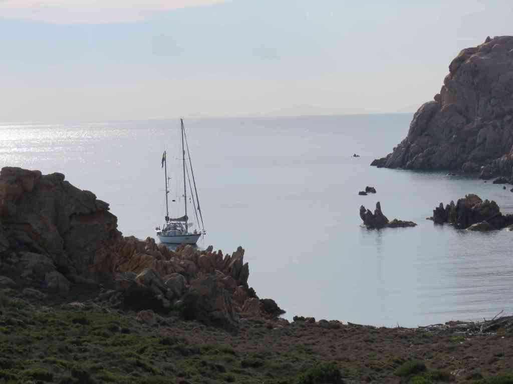 Dagen efter tog vi morgon dopp och plockade ihop oss och seglade till Sardiniens nordöstra sida, ön Razzoli. Razzoli är en av öarna i Maddalenas skärgård. Vi ankrade i viken cala Lunga. Här tog vi oss med dingen till en liten brygga som vi förtöjde och promenerade längs den gamla åsnevägen upp till fyren som var ett gammalt järnvägsspår som de bebodda använde till att transportera bränsle och matförnödenheter upp till fyren. Fyren står strategisk längst upp och man har en vidunderlig utsikt över den förtrollande landskapet och till Korsika. Fyren byggdes 1843 och är nu under ombyggnad. Här går sägnen om en ung kvinna, dottern till fyrmästaren som begravdes här efter att ha dött i barnsäng. Man kan fortfarande höra hennes hjärtskärande skrik vissa nätter. Det var lite kusligt när mörkret föll över viken. Vi hörde ingenting. Tack och lov för det. Annars skulle jag bett Kapten att vi måste flytta på oss. 😂Här låg vi en natt.