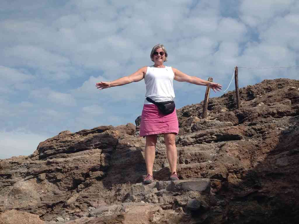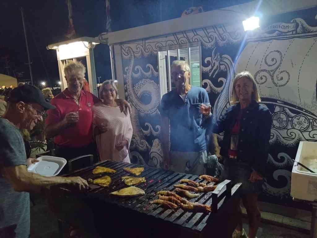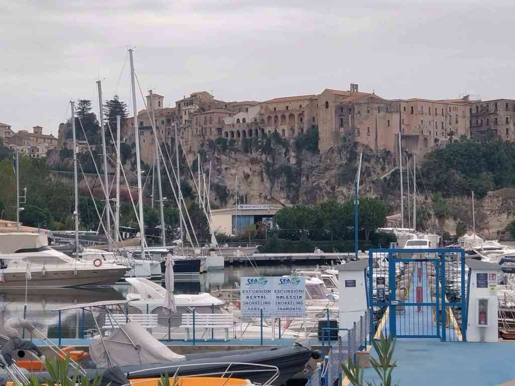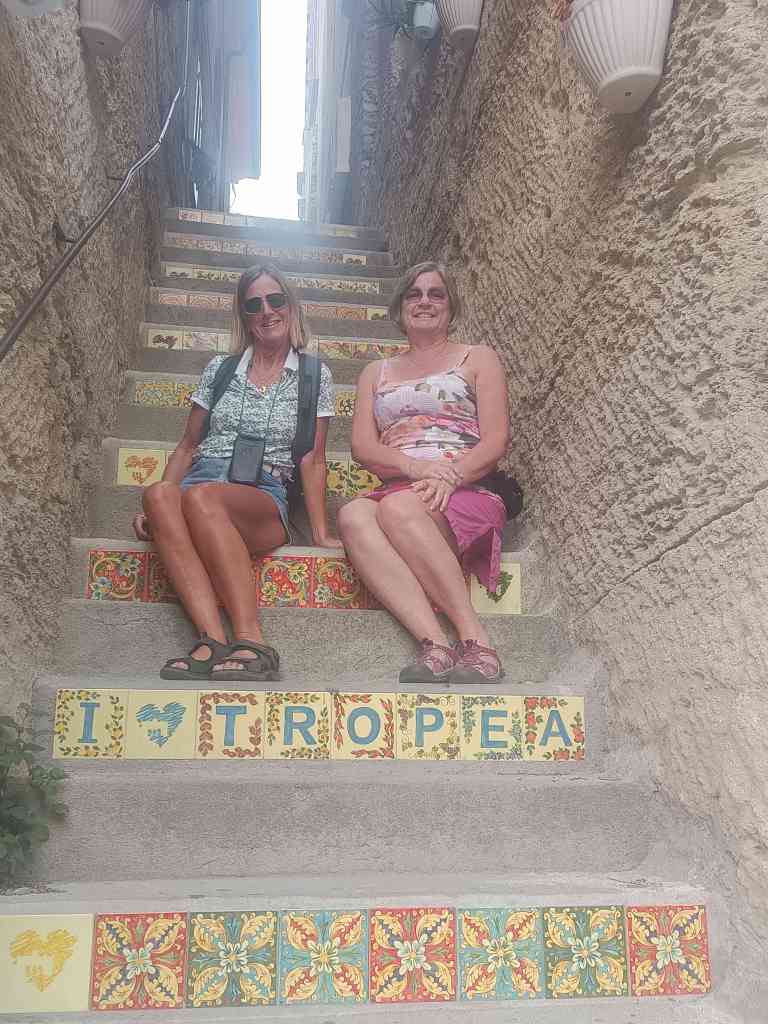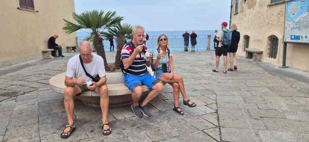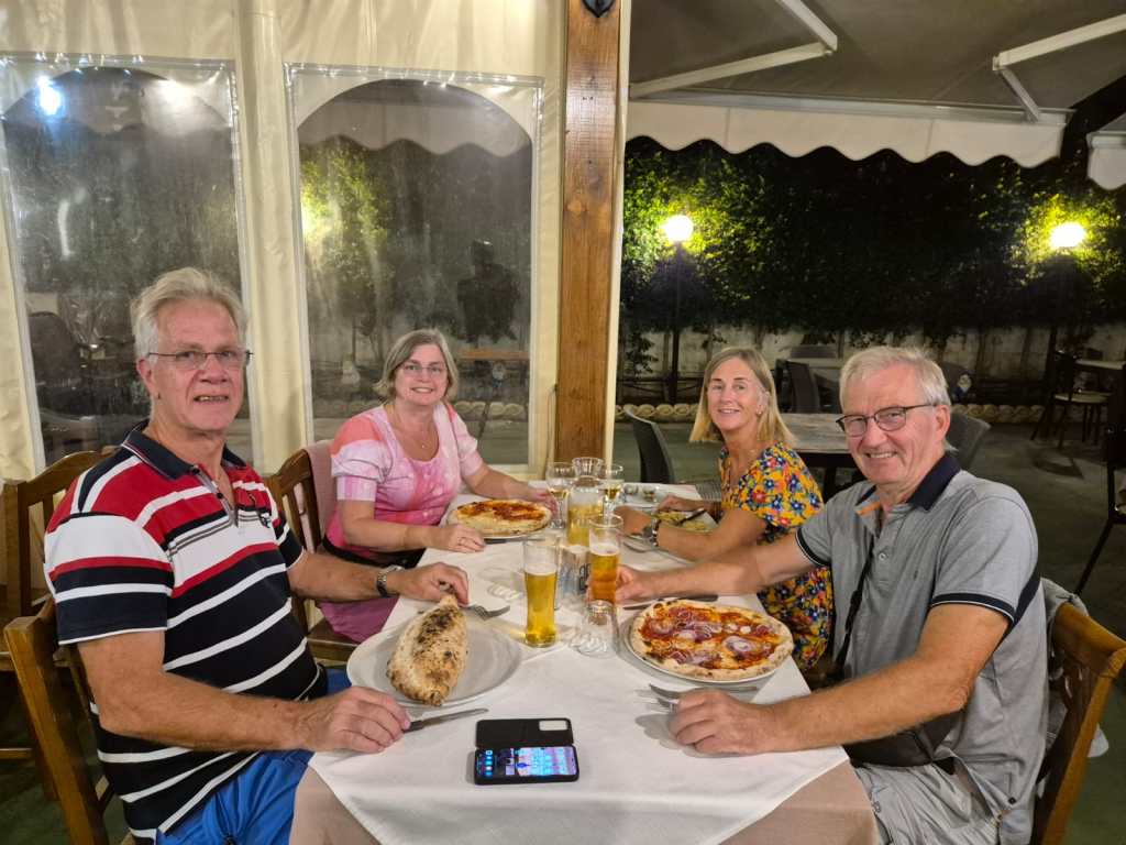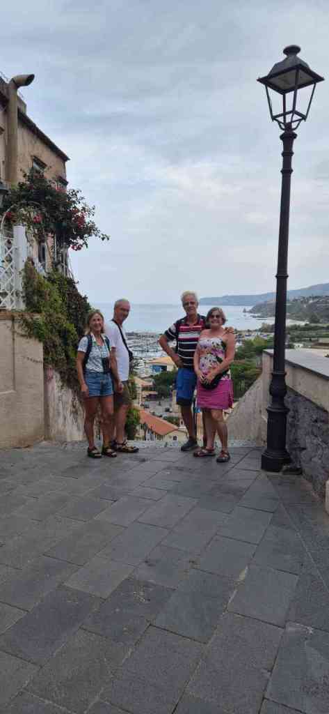 Efter detta stopp kom vi fram till hamnen i Vibo marina. Här kom Carina och Peter den 17 oktober, 2024. Innan dom kom hade vi ett par dagar som vi fixade och förberedde inför deras ankomst. Marinan var basic men rent och billigt. Vi fick en flaska bubbel. Tillslut kom dom!! Jätte kul!! Vi åt lunch och drack bubbel som vi hade fått. Flaskan som vi hade köpt tog vi ett annat tillfälle. Efter lunchen gick vi och badade. På kvällen promenerade vi till centrum och gick på restaurang. Jätte goda pizzor och jätte gott husets vin. Staden var inte stor men mysig. Vi bestämde att gå till Tropea nästa morgon. Det var inte lång tur. Vi kom fram vid lunch. Vi tog en promenad till byn. Det var många trappor upp. När vi kom upp strosade vi runt i de smala gränderna det var en otroligt vacker by som ligger på höjden. Nedanför är det vita sandstränder med azurblått vatten. Så vackert!! Första stoppet blev glass. Sedan fortsatte vi att strosa runt och avslutade promenaden med att jag och Carina tog aperol spritz och Peter och Lars tog en öl. Det var en mycket trevlig servitör som pratade med oss och han är med på bild, se nedan. Marinan var mycket fin och rent. Det fanns tvättmaskiner och torktumlare i hamnen. Nästa dag regnade det och vi passade på att tvätta eller snarare jag tvättade. Carina följde med och hjälpte mig. Senare på dagen slutade det att regna och vi gick till stranden för där fanns det en grotta som man kunde simma till. Det blev sent och vi bestämde att köpa pizza och äta hemma. När vi gick hängde regnet i luften och vi gick snabbt till pizzerian som låg vid stranden ca 20 minuter. Vi fick beställt pizzorna och snabbt tillbaka hem och sedan kom regnet. I bland ska man ha tur!!