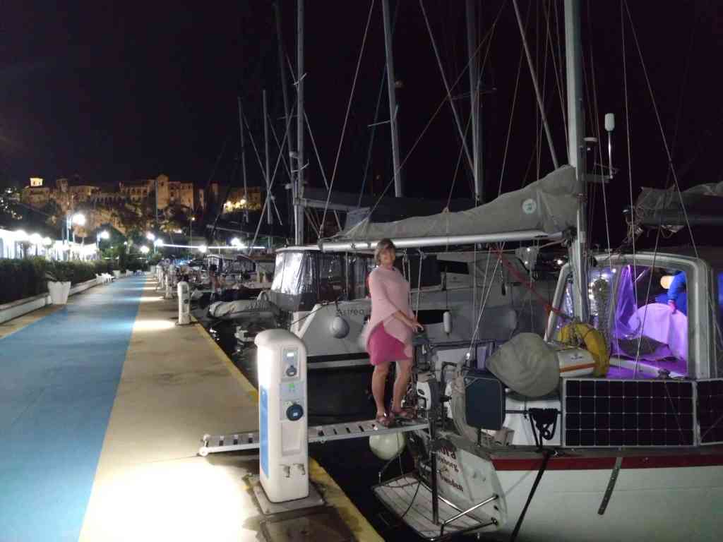 Vi hade beslutat att vi seglar ett långt ben första dagen, ett dygn. Det blev 130 Nm. Vi hade planer att gå till Neapel. När vi skulle boka hamnplats skulle dom ha närmare 2 000 kronor per natt och det var i oktober. Det sa vi att det betalar vi inte. Vi hade tänkt att besöka bl.a. Pompeji, Vesuvius, katakomberna mm. Hade vi haft mera dagar på oss hade vi valt en hamn längre i från och kunnat ta tåget eller bussen till Neapel. Vi bokade i stället hamnen på den lilla ön väster om Neapel, Procida. Det var första gången vi upplevde total nonchalans från marineros. Vi fick knappt någon hjälp med tilläggningen och vi hade också vind i sidan och stressade var dom också. Sedan förstod vi att vi störde dom mitt i maten. Det spelade ingen roll för priserna på hamnarna runt omkring Neapel är jätte höga och man förväntar att få hjälp och fram för allt lite artighet och engagemang när man kommer. Ön var i alla fall charmig. Här stannade vi i två dygn och fick en hel dag som vi roade oss med att tvätta och strosade runt. Sedan fortsatte vi till viken Degli Infreschi. Vi kom fram omkring midnatt. När vi närmade oss viken var det mycket lampor som lyste och det var svårt att jämföra verkligen och tyda sjökortet. Det var markeringar för fiskeområden och grund. När vi vaknade nästa dag och tittade ut såg vi att viken var jätte fin med grottor och klart vatten. Vi studerade vädret och såg att vi kunde vara kvar i 2 dagar. Vi fick en välbehövlig vila och vi utforskade viken och grottorna. Nästa stopp var det i Cetraro här tankade vi och vi såg att det fanns en Lidle. Vi bestämde att vi går dit efter en stund skulle vi gå förbi en bil och vi mötte en äldre herre som började prata med oss på lite engelska och gestikulerade och pekade åt hållet som Lidle låg. Mannen öppnade bagageluckan och vi trodde att han skulle lägga in något då pekade han på våran kärra. Då fattade vi att han skulle också dit och vi skulle få skjuts. Misstänkta som vi är tänkte vi att han är äldre och han vill bara vara hjälpsam. Vilken gentleman!! När vi var i Lidle kände jag/vi att vi var iakttagna. Det var mannen som stod stilla och jag gick fram och frågade med hjälp av Google translate på italienska om det var oss han väntade på. Mannen sken upp och sa si,si och pekade på bilen. Vi förstod igen han skulle vänta på oss och skulle skjutsa oss tillbaka till hamnen. Nu fick vi bråttom. Det var inte lite vi skulle handla och en ny affär. Vad fanns allt?? 😃Vi ville betala men han skakade på huvudet och öppnade sin plånbok där låg sedlar och att han behövde inga pengar. Mannen blev lite för närmad. Under färden tillbaka till marinan fick han samtal och vi misstänkte att det var frun som undrade var han höll hus för det som han handlade var 5-6 saker i en påse och var borta en längre stund. Vilket underbart möte!! När vi kom fram pekade vi på Tindras flagga och vi sade Sweden han svarade att han hade varit i Malmö.