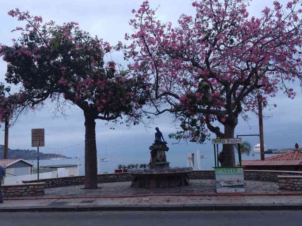 Efter vi hade varit på Lipari fortsatte vi till Vulcano. Vi lade oss i viken nedanför vulkanen. Öns namn kommer från den romerska guden för eld och smide. Ön har också gett namnet åt astroiden Vulcano. Slutet av 1800-talet täpptes kratern till. För att utjämna trycket i vulkanen pressas kontinuerligt starkt luktade svavelångor ut genom ett hål. Det luktar som ruttet ägg. Den här vulkanen vandrade vi upp till, cirka 350 meter. Efter vandringen när vi kom ner såg vi ”trafikljus” grön och röd lampa. Lyser den röd får man inte vandra upp för då är det för höga svavelångor. Den var släckt när vi började vandra upp. Nu lyste den röd. Vilken tur vi hade och kunde uppleva detta. När vi kom upp fick vi en vidunderlig, vacker utsikt över öarna och viken där Tindra låg. Det var lite surrealistiskt här stod vi och tittade ner i en jätte, stor krater som man kunde se ångorna komma upp. Den är ju aktiv! 😱Vi hittade en skalbagge som var färggrann, orange med namnet röd palmvivel som visade vara ett skadedjur för palmer så som dadel-, kokos- och oljepalmer som har spridit sig till medelhavsområdet från Asien. Se bilden nedan. När vi kom tillbaka badade jag och Carina, vi simmade runt Tindra. När vi kom halvvägs blev Carina stungen av något. När hon gick upp såg vi en svullnad och rodnad. Vi tog ett bankkort och skrapade för säkerhets skull om det skulle vara en manet, om det fanns några trådar kvar och vi kylde ner armen. Efter ett par timmar gick svullnaden ner. Nästa dag fortsatte vi till fastlandet Sicilien, nordost där la vi oss på svaj vid stranden, Acqualadroni för natten. Därefter gick vi till Naxos och la oss på svaj. Vi stannade till och tankade i Messina. I Naxos tog vi dingen in till land och tog en promenad. Det var en fin utsikt till Taormina och Castelmola.